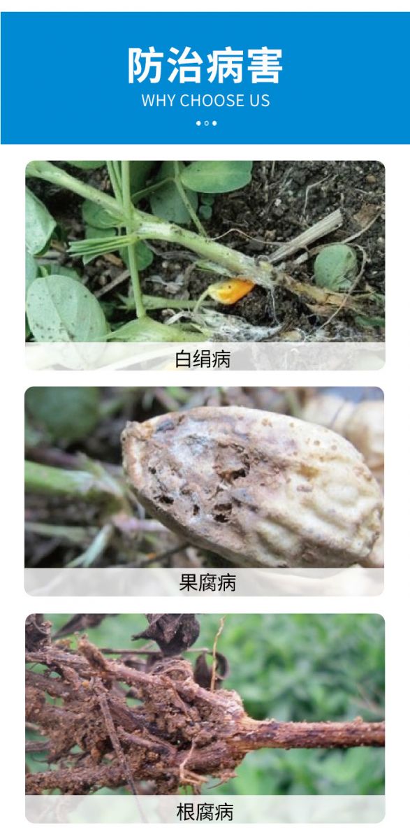 | Peanut | 1. Mix with base fertilizer and broadcast. 2. Broadcast on soil surface | Sowing stage, initial flowering stage | Root rot / Southern blight | 1 bag for 2-3 Mu |