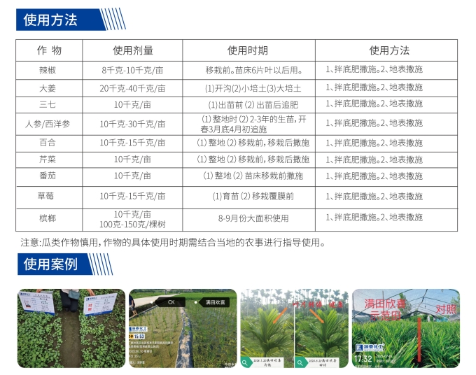 | Panax Notoginseng | 10 kg per Mu | (1) Before seedling emergence (2) Topdressing after seedling emergence | 1. Mix with base fertilizer and broadcast. 2. Broadcast on soil surface |