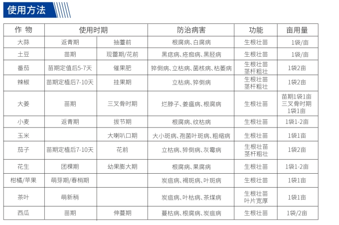 | Garlic | Regreening stage | Before bolting | Root rot, White rot | Promote root growth and seedling strengthening | 1 bag per Mu |