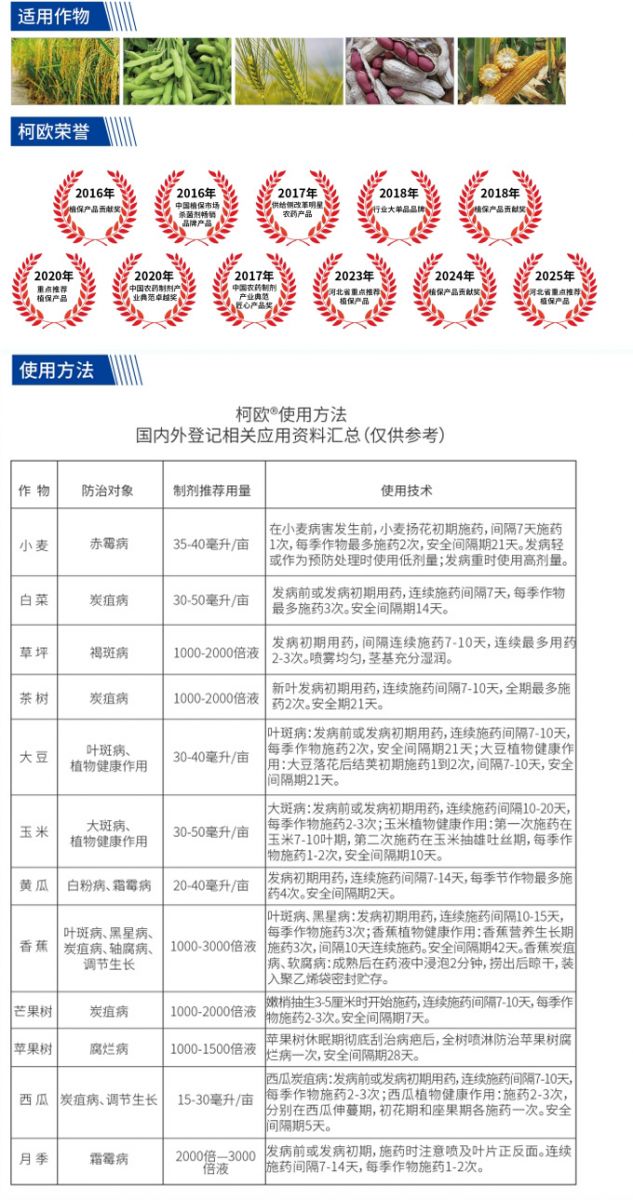 | Soybean | Leaf spot, Plant health promotion | 30-40 ml per Mu | For leaf spot: Apply before or at the initial stage of disease occurrence, reapply continuously every 7-10 days, with 2 applications per crop season and a pre-harvest interval (PHI) of 21 days; For soybean plant health promotion: Apply 1 to 2 times at the early podding stage after flowering, with an interval of 7-10 days between applications, and a pre-harvest interval (PHI) of 21 days. |