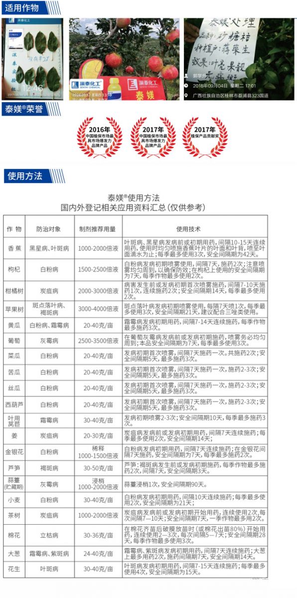 | Apple Tree | Alternaria leaf spot, Brown spot | 3000-4000 times dilution | Spray at the initial stage of Alternaria leaf spot occurrence, reapply every 7 days, with a maximum of 3 applications per crop season and a pre-harvest interval (PHI) of 21 days; it is recommended to use in combination with triazoles. |