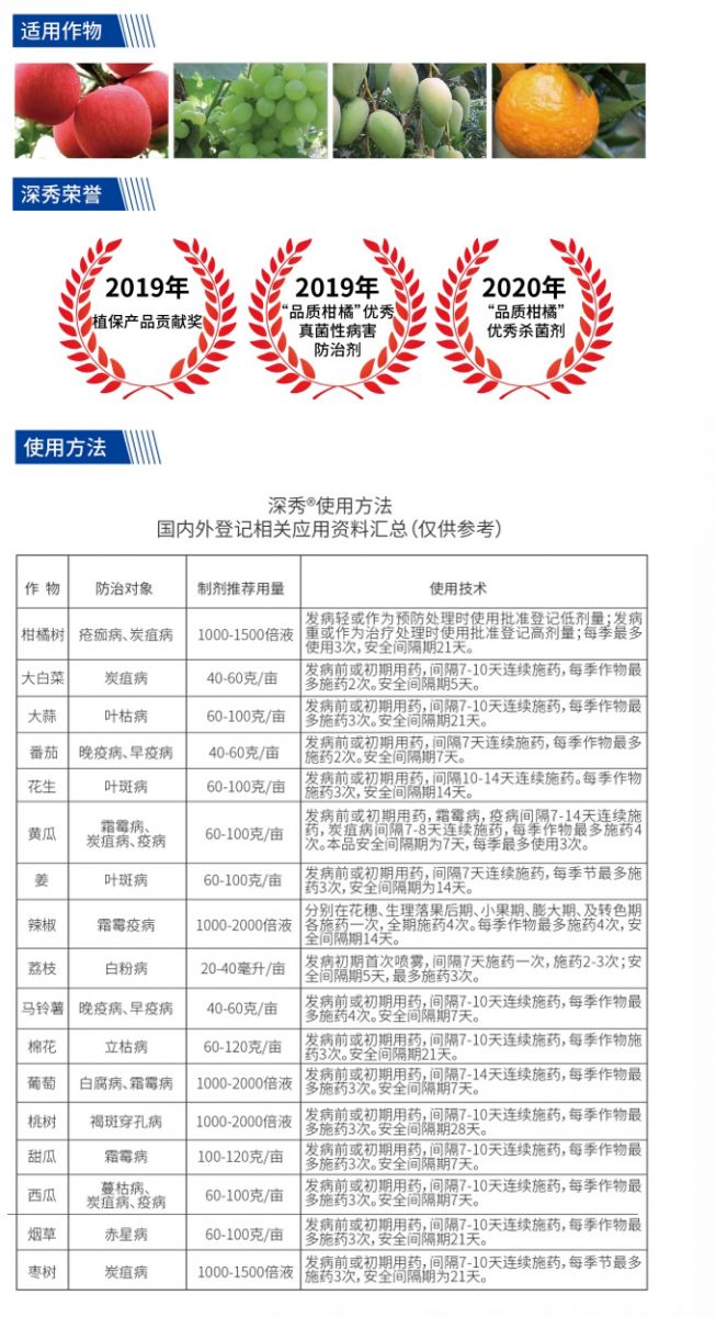 | Citrus Tree | Scab, Anthracnose | 1000-1500 times dilution | Use the registered low dosage for mild infection or preventive treatment; use the registered high dosage for severe infection or curative treatment; maximum 3 applications per crop season, with a pre-harvest interval (PHI) of 21 days. |