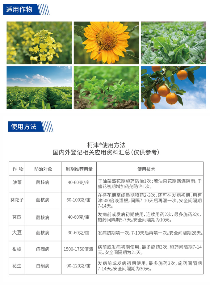 | Sunflower Seed | Sclerotinia | 60-100 g/acre | Spray 2-3 times from the full flowering stage to maturity stage. Additionally, at the early stage of disease occurrence, irrigate roots with Kejin® 500-fold dilution, and irrigate again after an interval of 7-10 days. Pre-harvest interval (PHI): 7-14 days. |