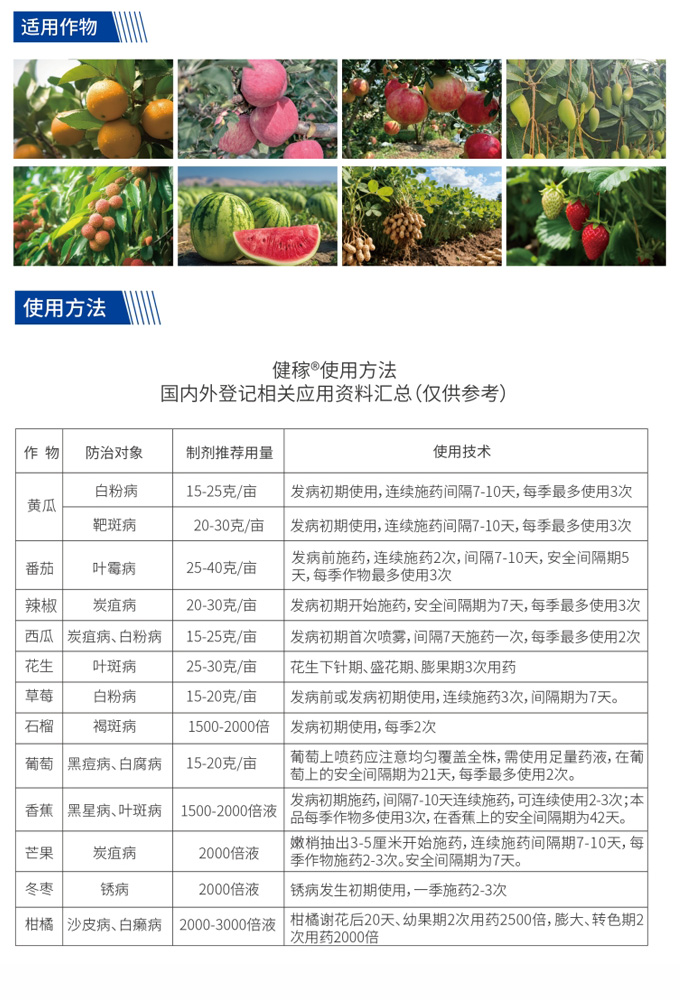 | Citrus | Scab (Sand Bark Disease), White Scab | 2000-3000-fold dilution | Apply twice at 2500-fold dilution at 20 days after citrus blossom fall and young fruit stage; apply twice at 2000-fold dilution at swelling and color turning stages. |