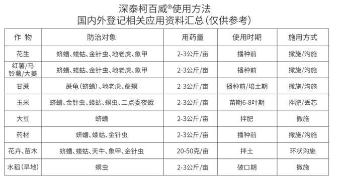 | Flowers, Nursery Stocks | White grubs, Longhorn beetles, Weevils, Wireworms | 20-50 g per mu | Mix with soil | Circular furrow application |
