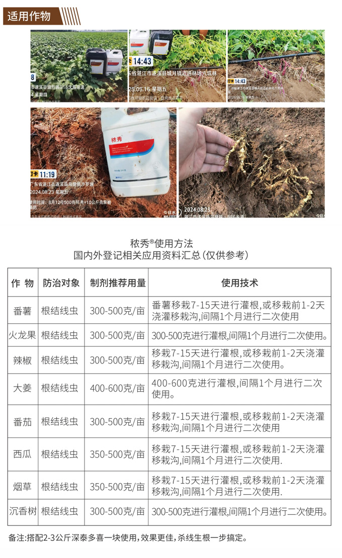 | Sweet Potato | Root-knot Nematodes | 300-500 g per mu | Irrigate roots 7-15 days after sweet potato transplanting, or irrigate transplant furrows 1-2 days before transplanting; reapply for the second time at an interval of 1 month |