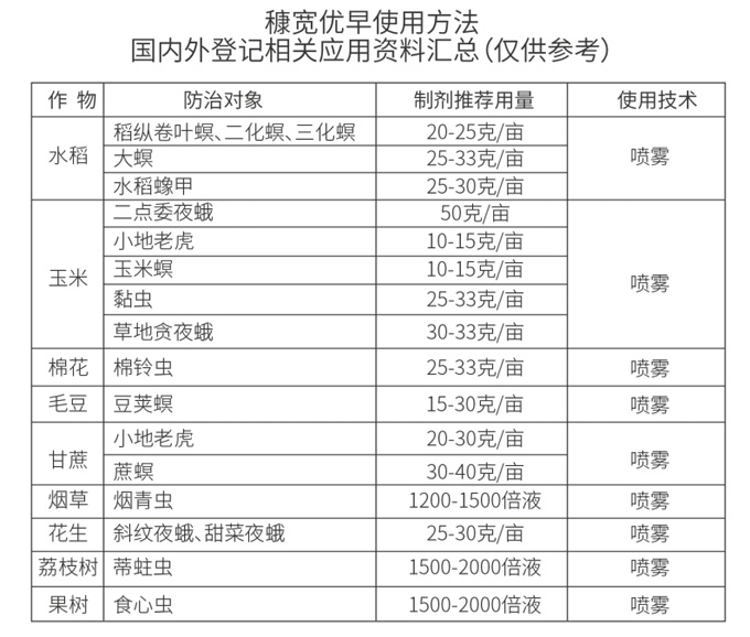 | Rice | Cnaphalocrocis medinalis, Chilo suppressalis, Tryporyza incertulas | 20-25 g/mu | Spray |