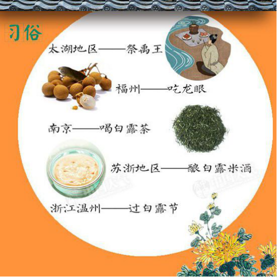 在太湖、苏浙地区,福州、温州、南京等地都有关于白露节的民俗文化。如:“春茶苦,夏茶涩, 要好喝,秋白露”说法。 白露节气饮白露茶是颇受南京人钟爱的民俗文化。此时的茶树经过一夏的酷热,进入了绝佳的生长时期,茶叶也仿佛在时间中熬出了最浓烈的品性。白露茶以甘醇清香为特色,所以这段时间,喝点白露茶既可以解渴提神又可以缓解“秋燥”,十分有利于秋天的保健。